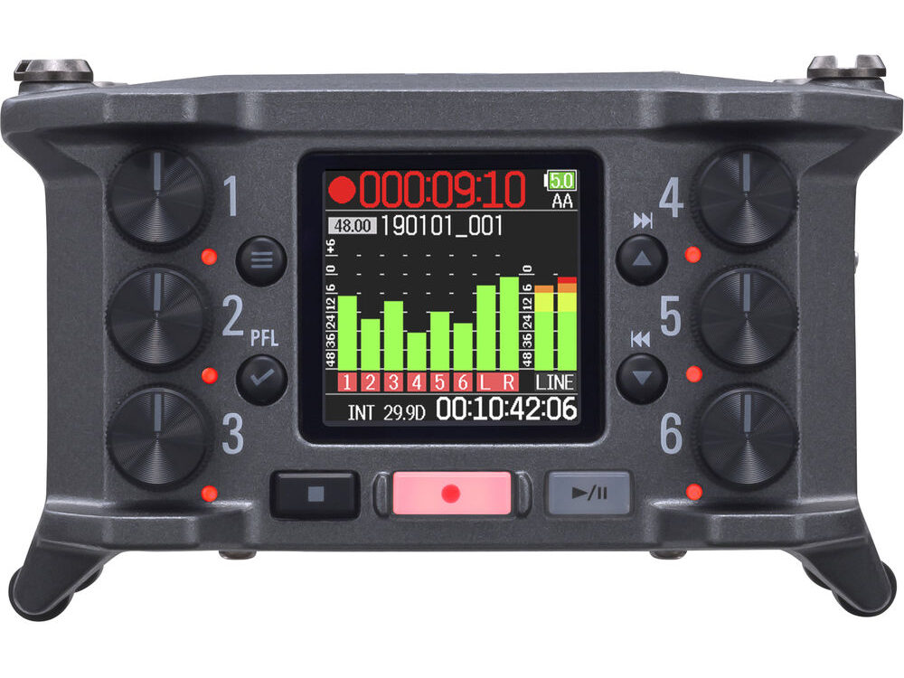 - 3.5mm TRS mini jack for timecode I/O with an accuracy to ±0.2 ppm. You can jam sync the F6 when constant external timecode isn’t present.