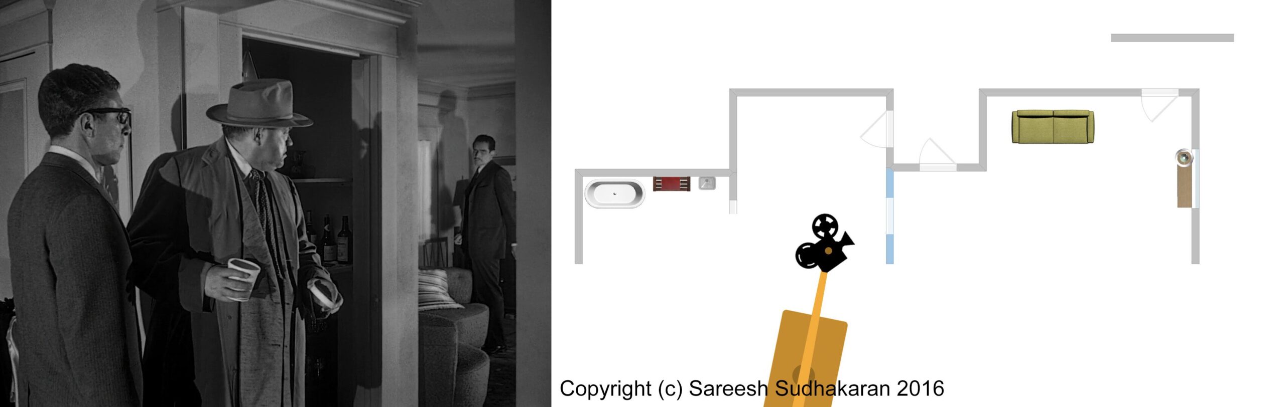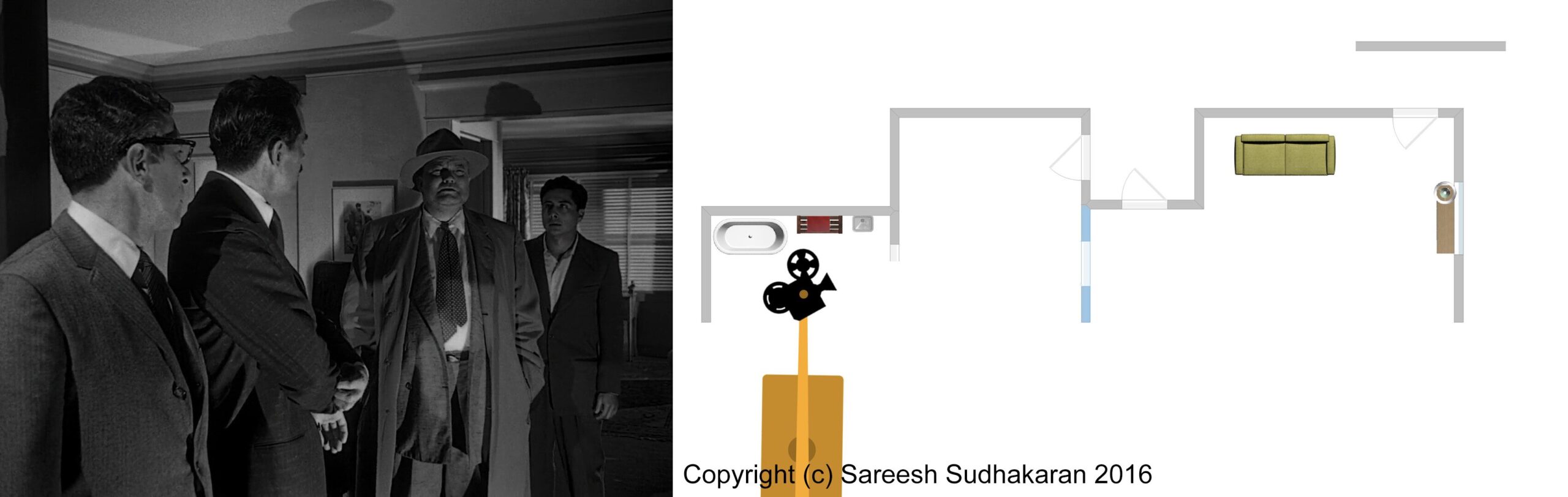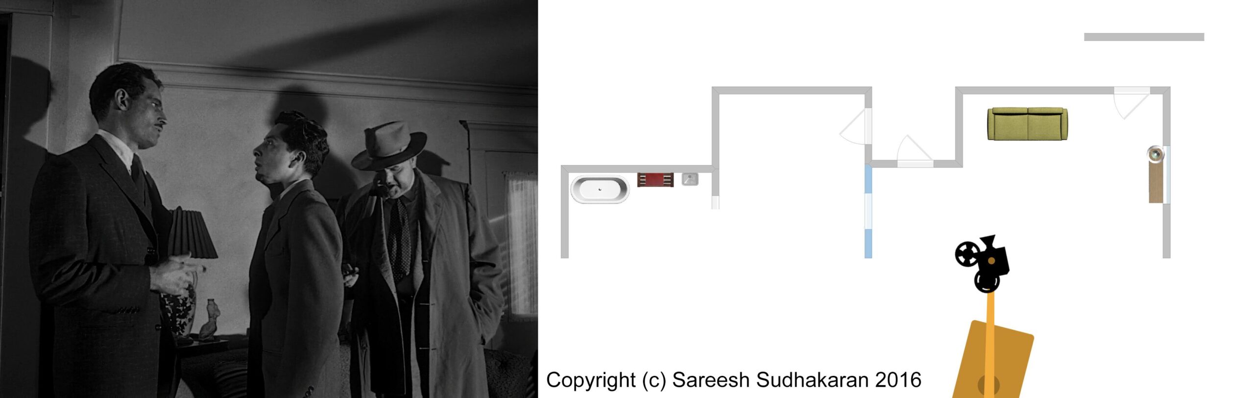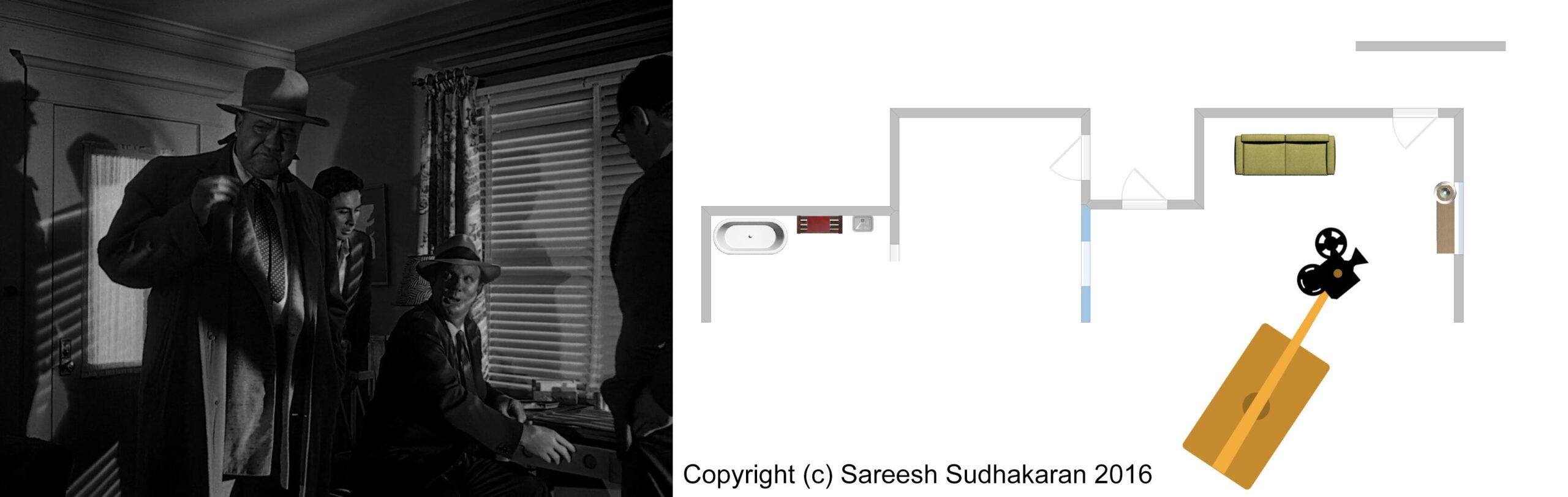Important: The apartment plan isn’t to scale. And, the exact crane movements, angles and lighting positions are all guesstimates. This is for informational purposes only. Please do not quote or use it as a serious or authentic study or resource. I will only be covering sections one and three.