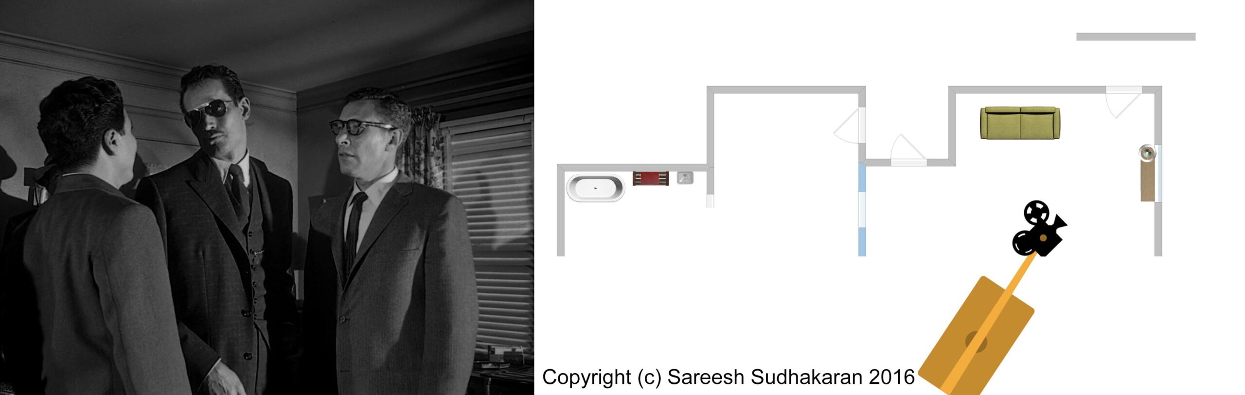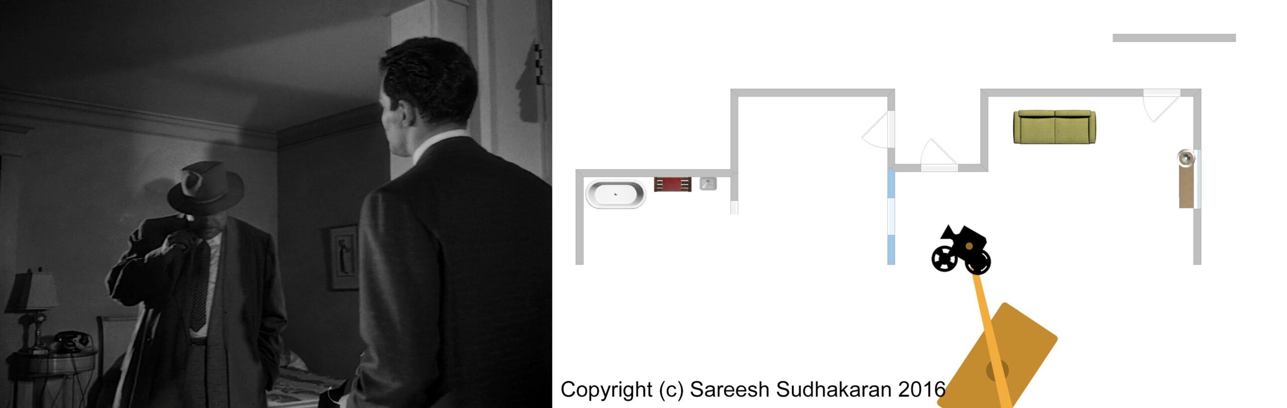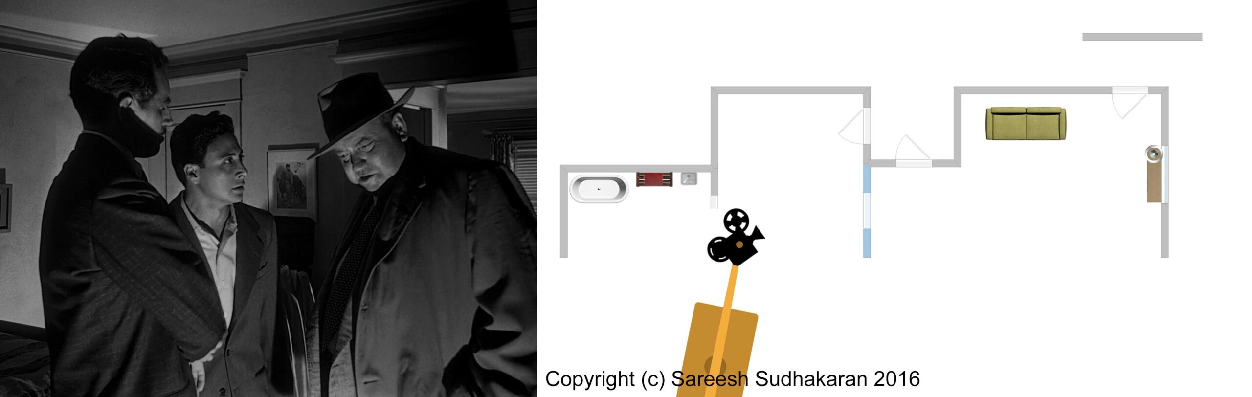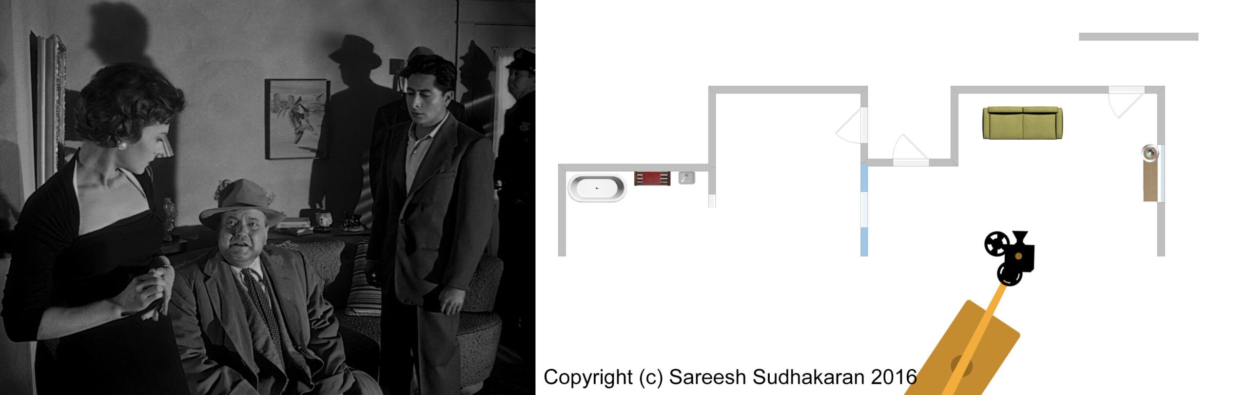 Important: The apartment plan isn’t to scale. And, the exact crane movements, angles and lighting positions are all guesstimates. This is for informational purposes only. Please do not quote or use it as a serious or authentic study or resource. I will only be covering sections one and three.