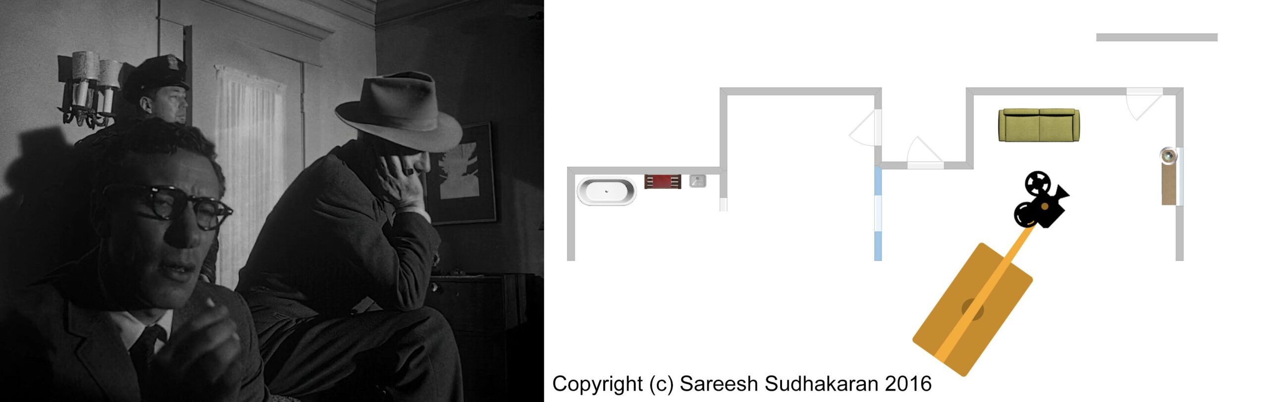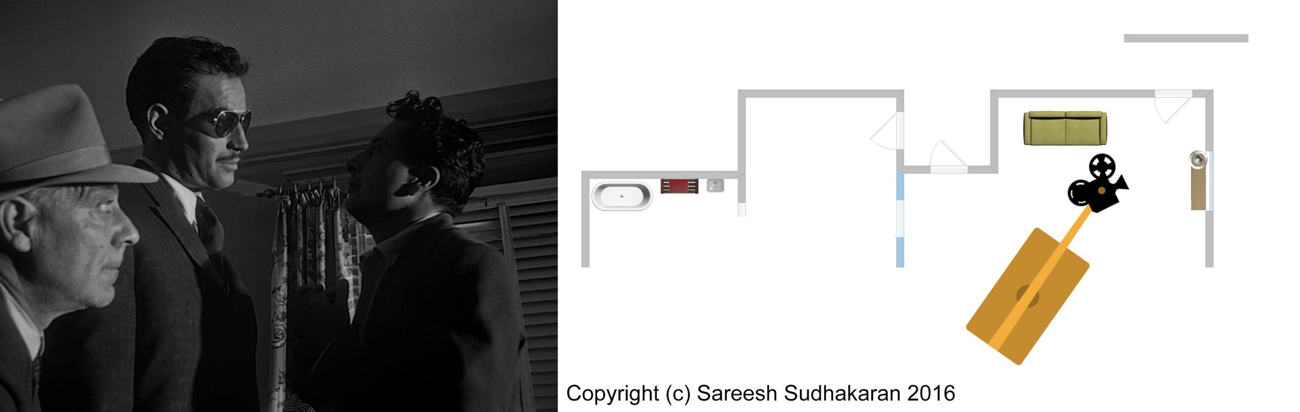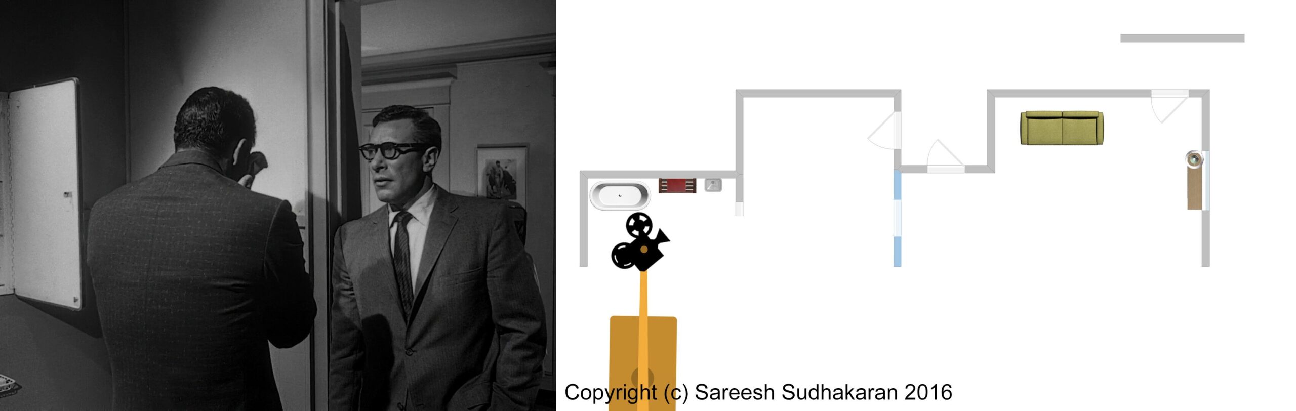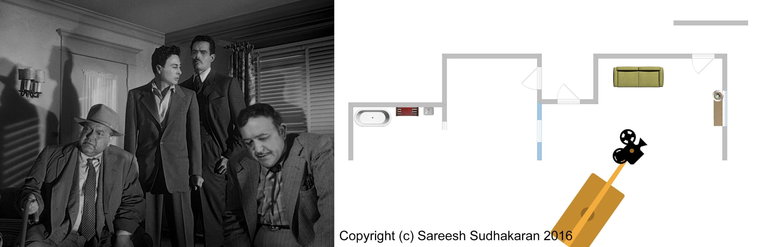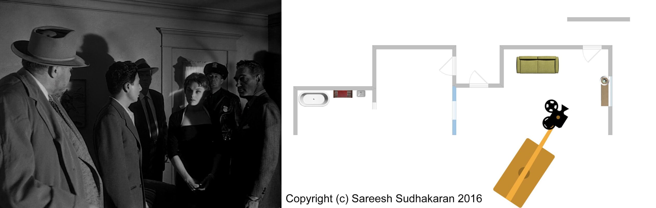 Important: The apartment plan isn’t to scale. And, the exact crane movements, angles and lighting positions are all guesstimates. This is for informational purposes only. Please do not quote or use it as a serious or authentic study or resource. I will only be covering sections one and three.