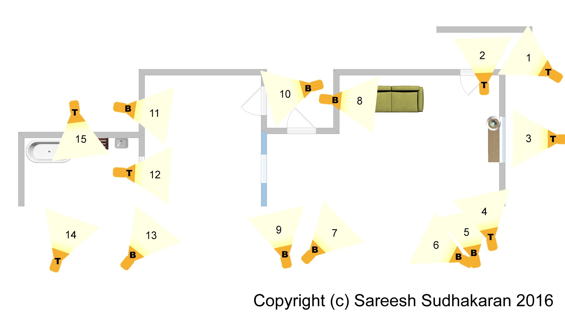 I counted a total of 15 lighting fixtures:
