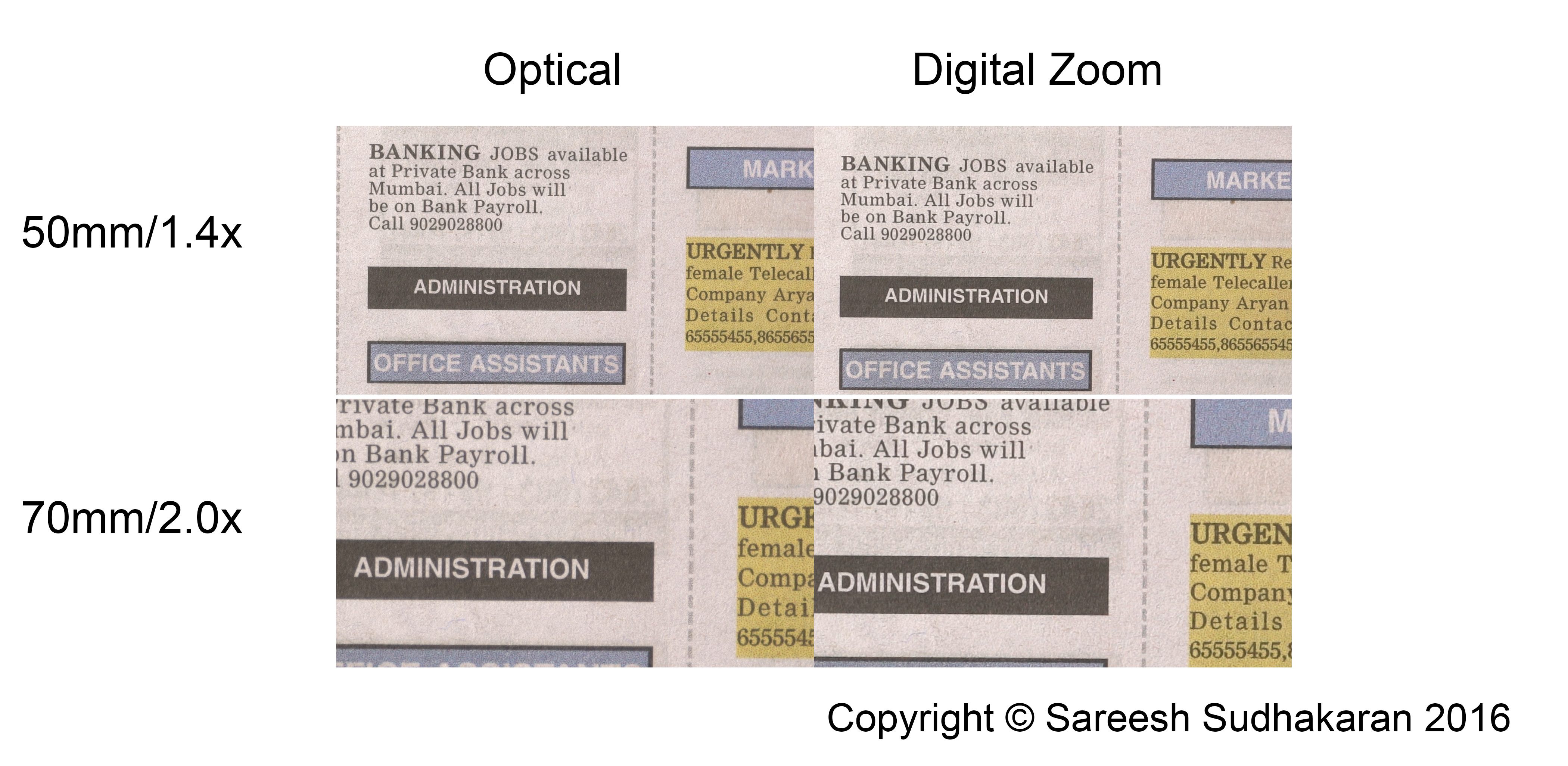 Can we trust ClearImage Zoom blindly, or can it replace a zoom lens? Here’s a comparison of a 35mm shot with 2x ClearImage Zoom vs a 50mm and 70mm scene shot optically, on the same lens (click to enlarge):
