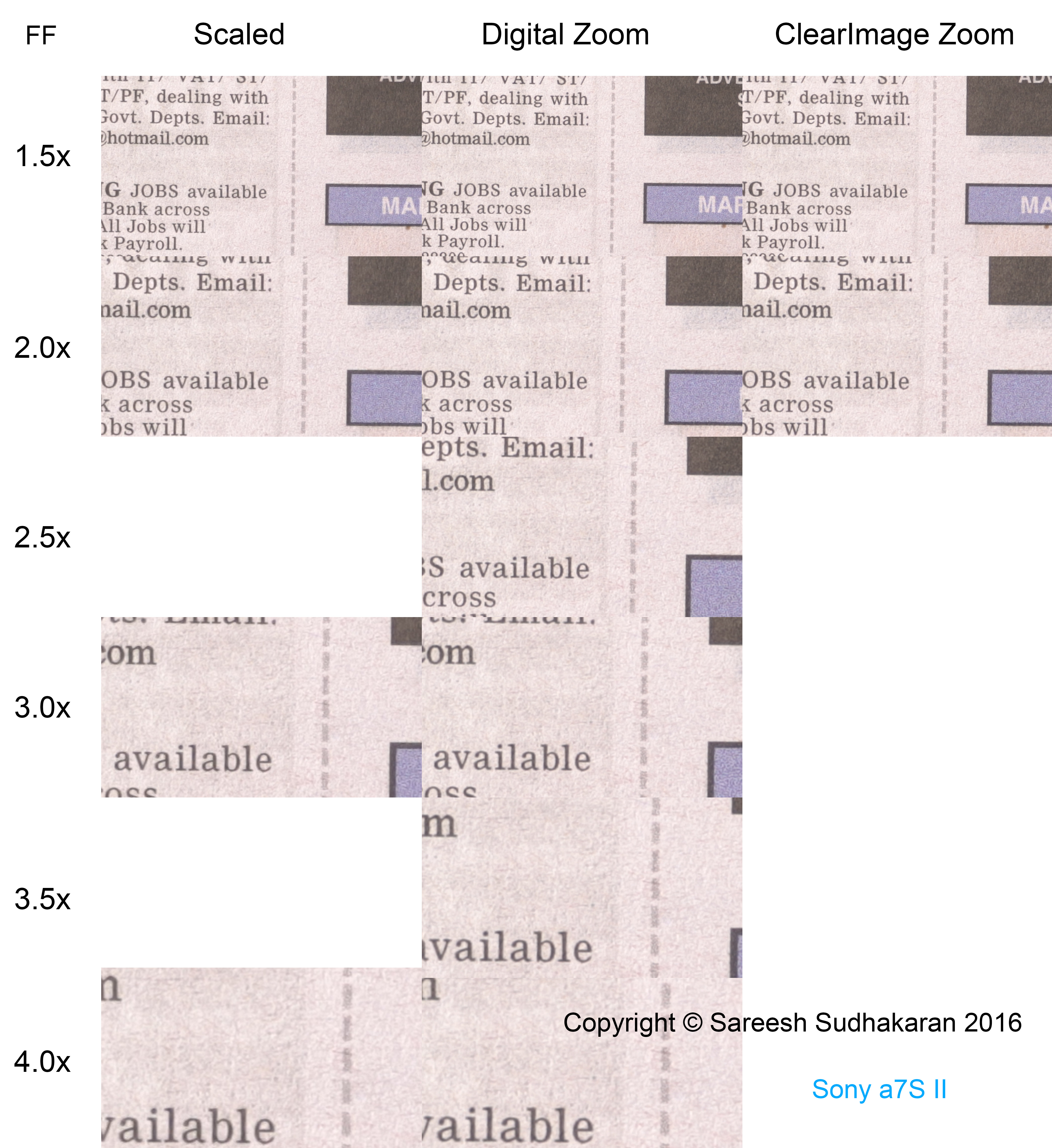 First of all, something important: The ‘resolution’ advantage of ClearImage Zoom or Digital Zoom can be the result of sharpening applied, because after all, this is a test of resolution. You could get similar results in post production. You don’t gain actual resolution, but seemingly, you don’t lose noticeable resolution either.