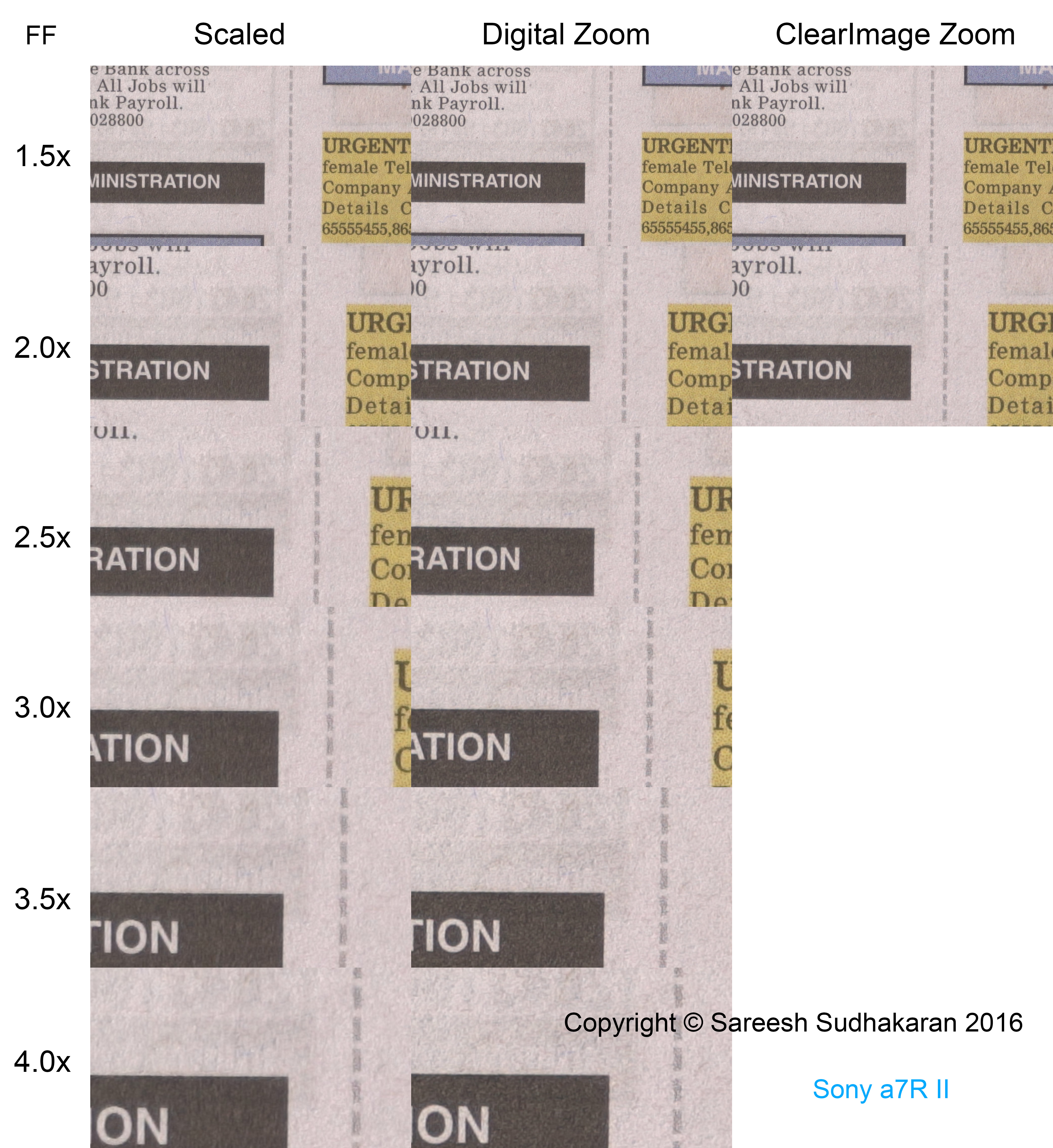 First of all, something important: The ‘resolution’ advantage of ClearImage Zoom or Digital Zoom can be the result of sharpening applied, because after all, this is a test of resolution. You could get similar results in post production. You don’t gain actual resolution, but seemingly, you don’t lose noticeable resolution either.