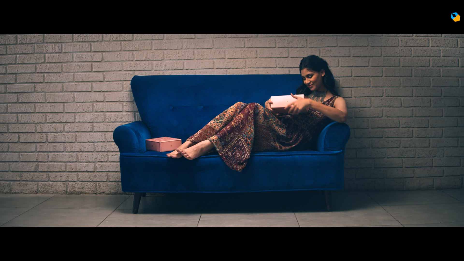 In the second scene we go to 2.39:1 because I had a blue couch and tiled wall that allowed that sort of composition. We also had a box and girl at either end, and it was about her journey from one end to the other: