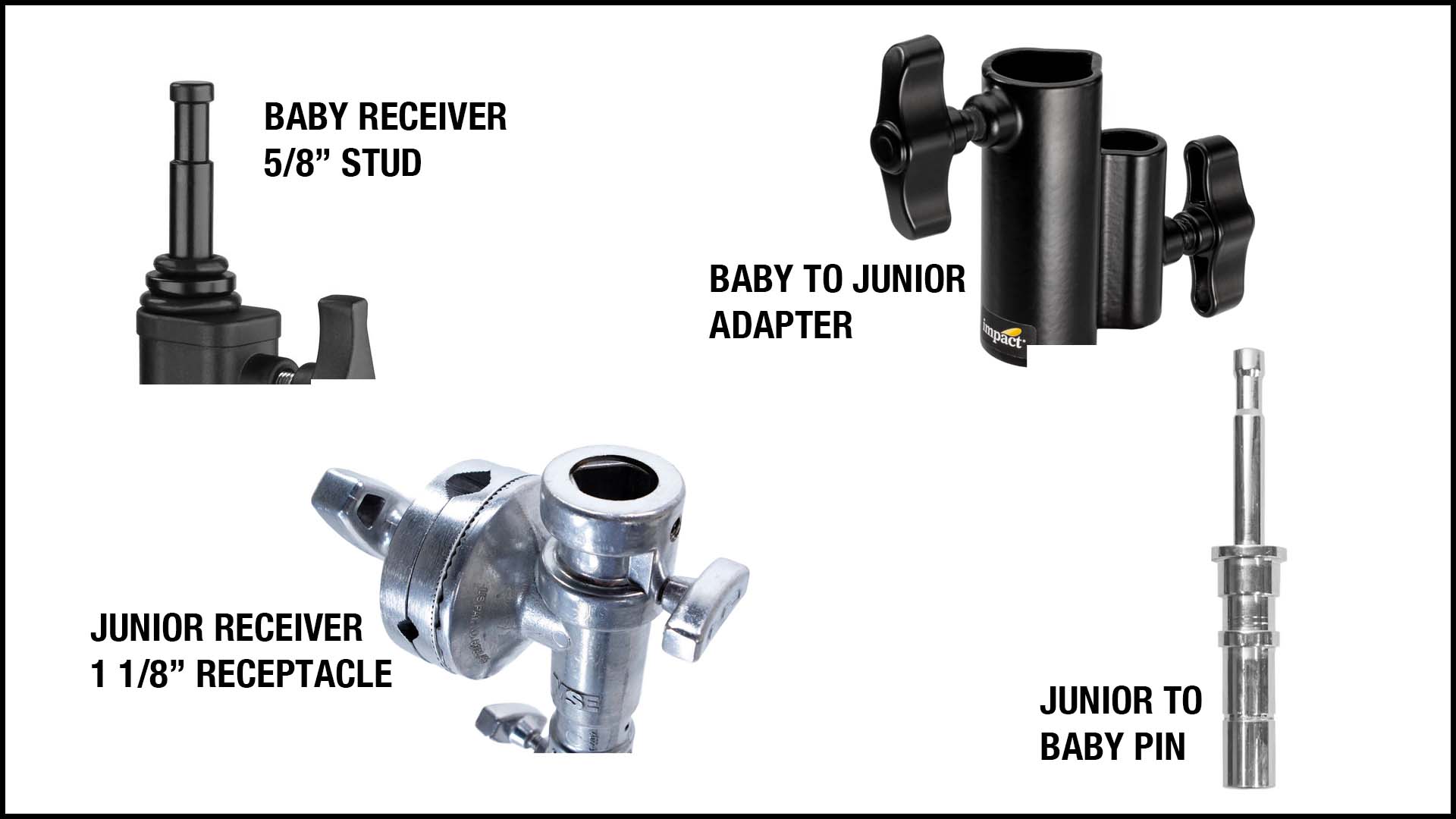 As far as film lighting is concerned, you’ll be dealing mostly with Baby, Junior and adapters: