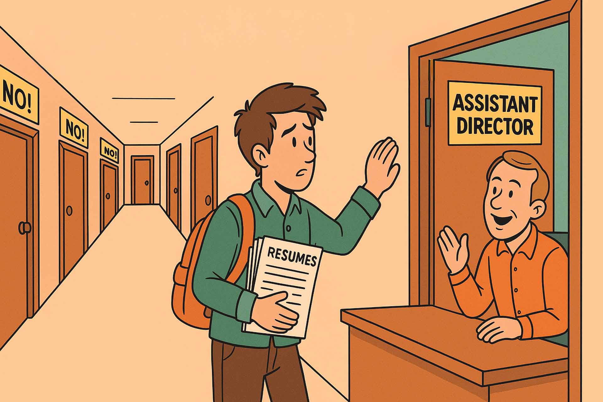 Some people are rude. “May I drop in my resume?” “No, we don’t accept them.” “Is there a better time I can retur–” “No!” “Is there someone–” – they’re no longer listening.I smile, and show myself out. This exact sequence happened many times. I went through every single door in the complex, and there were hundreds of them and I lost count. I finally reached the very last corridor, and this office looked like it had some activity. I was hungry, and wanted to get out of there.I knocked, and a man said “Open!” I opened, but didn’t step in (I was used to being rejected).“Are you looking for an assistant director?” (My exact words).