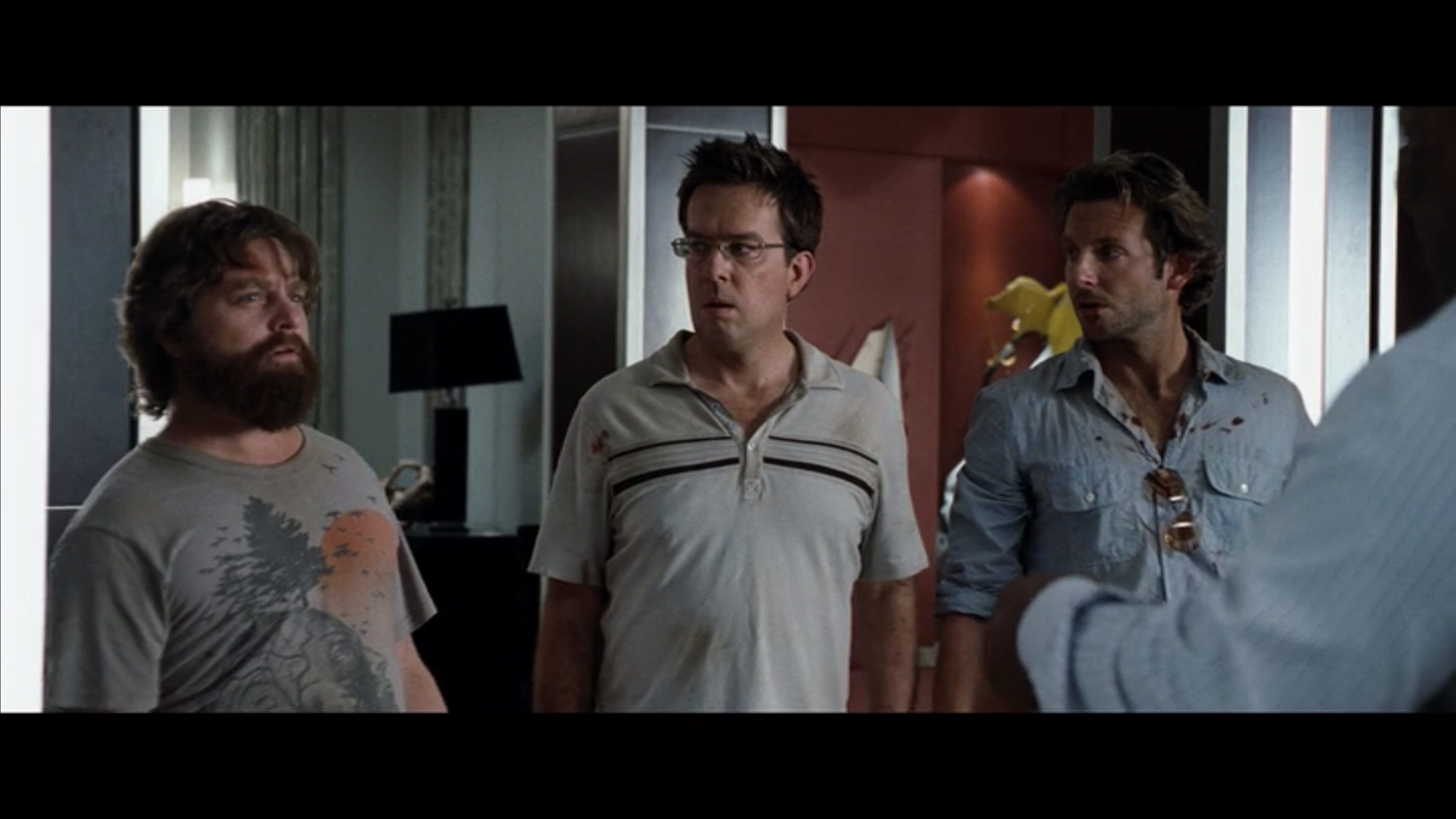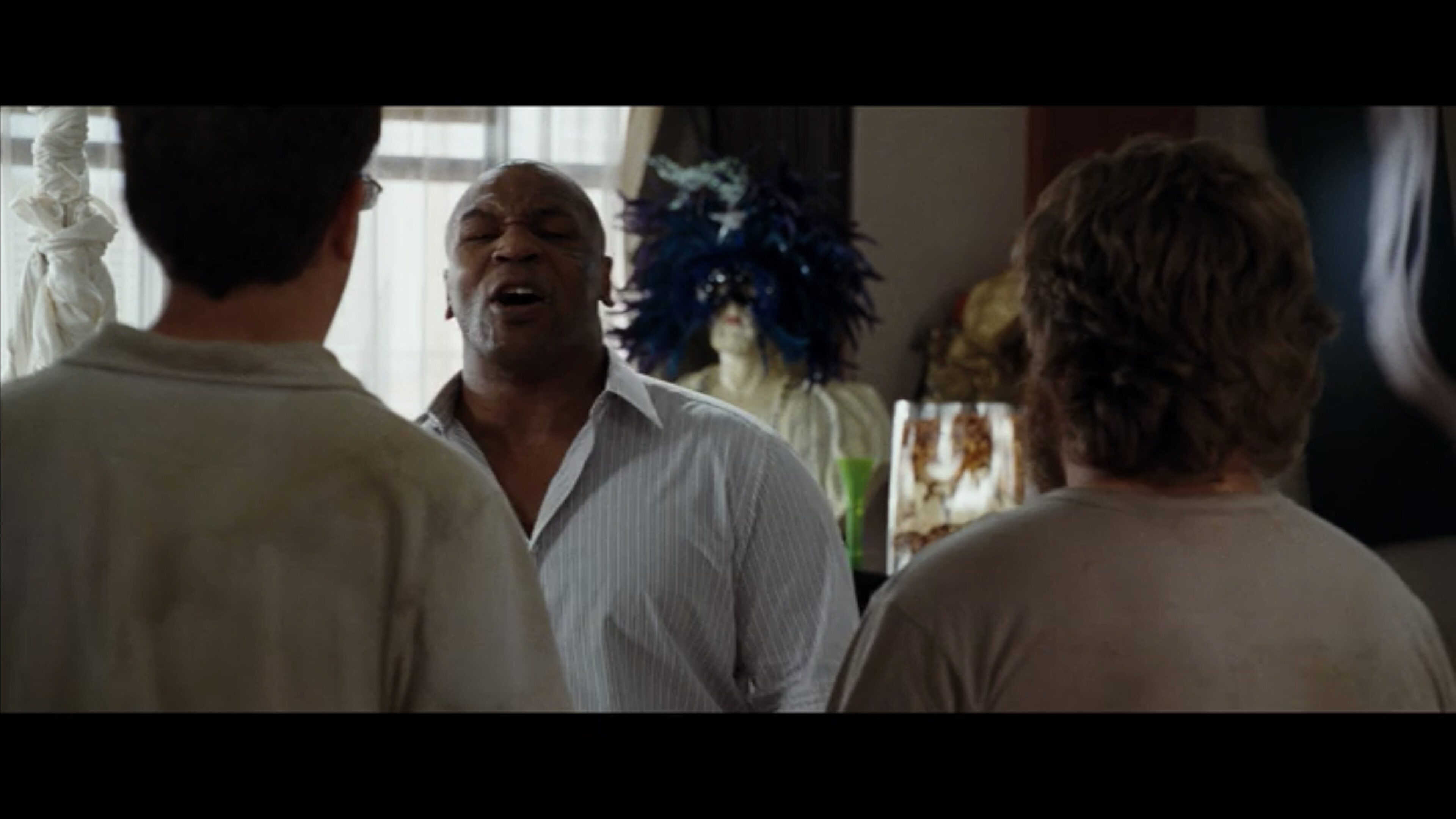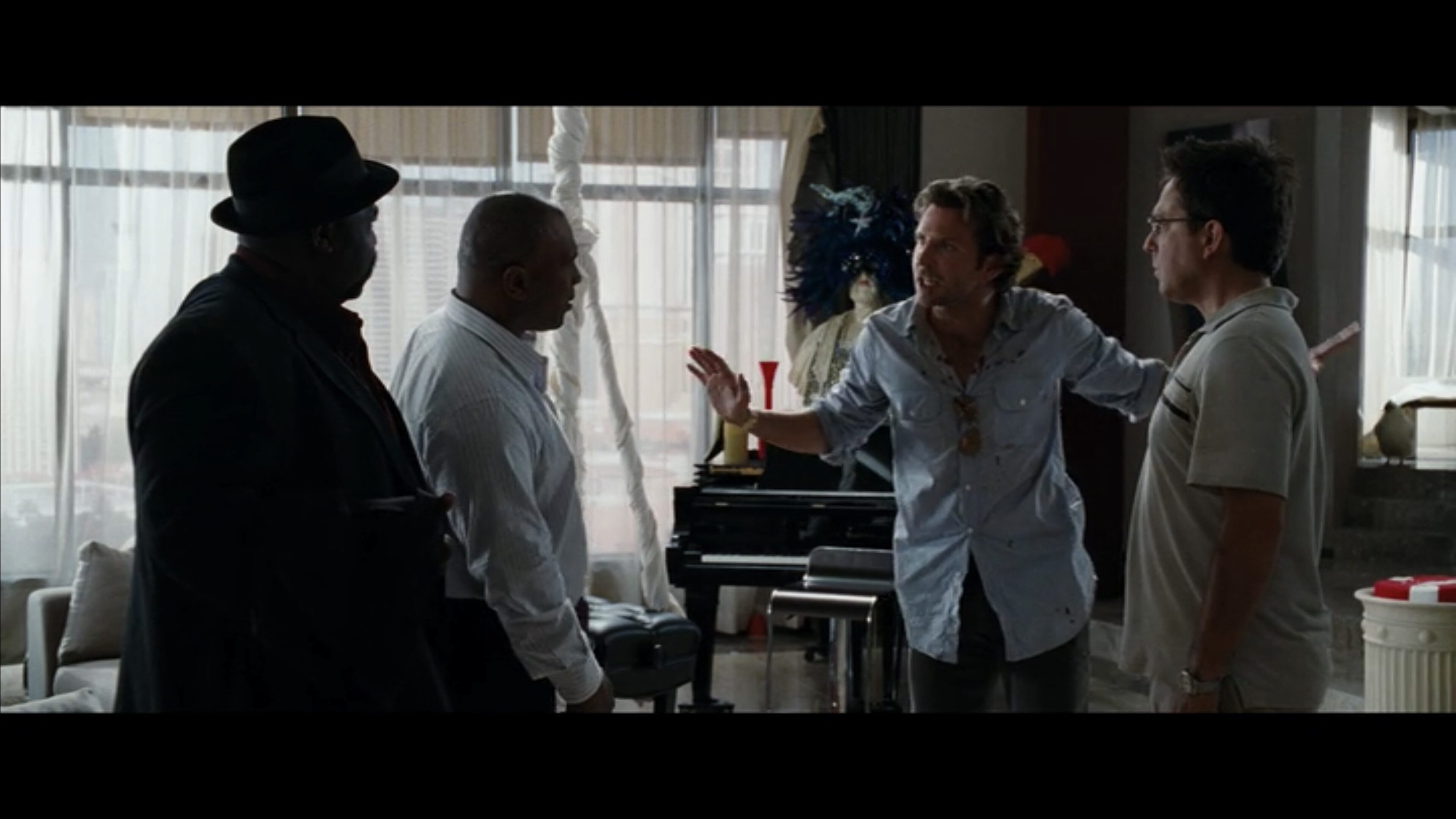 Here are a few examples from Hangover, directed by Todd Phillips, from the scene where Mike Tyson shows up. These are not necessarily masters, but just examples of a wide shot: