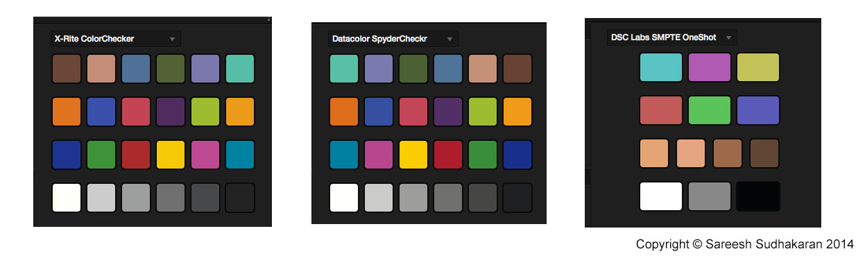As of DaVinci Resolve 11, there are three standard color palettes available to match colors, based on the following charts: