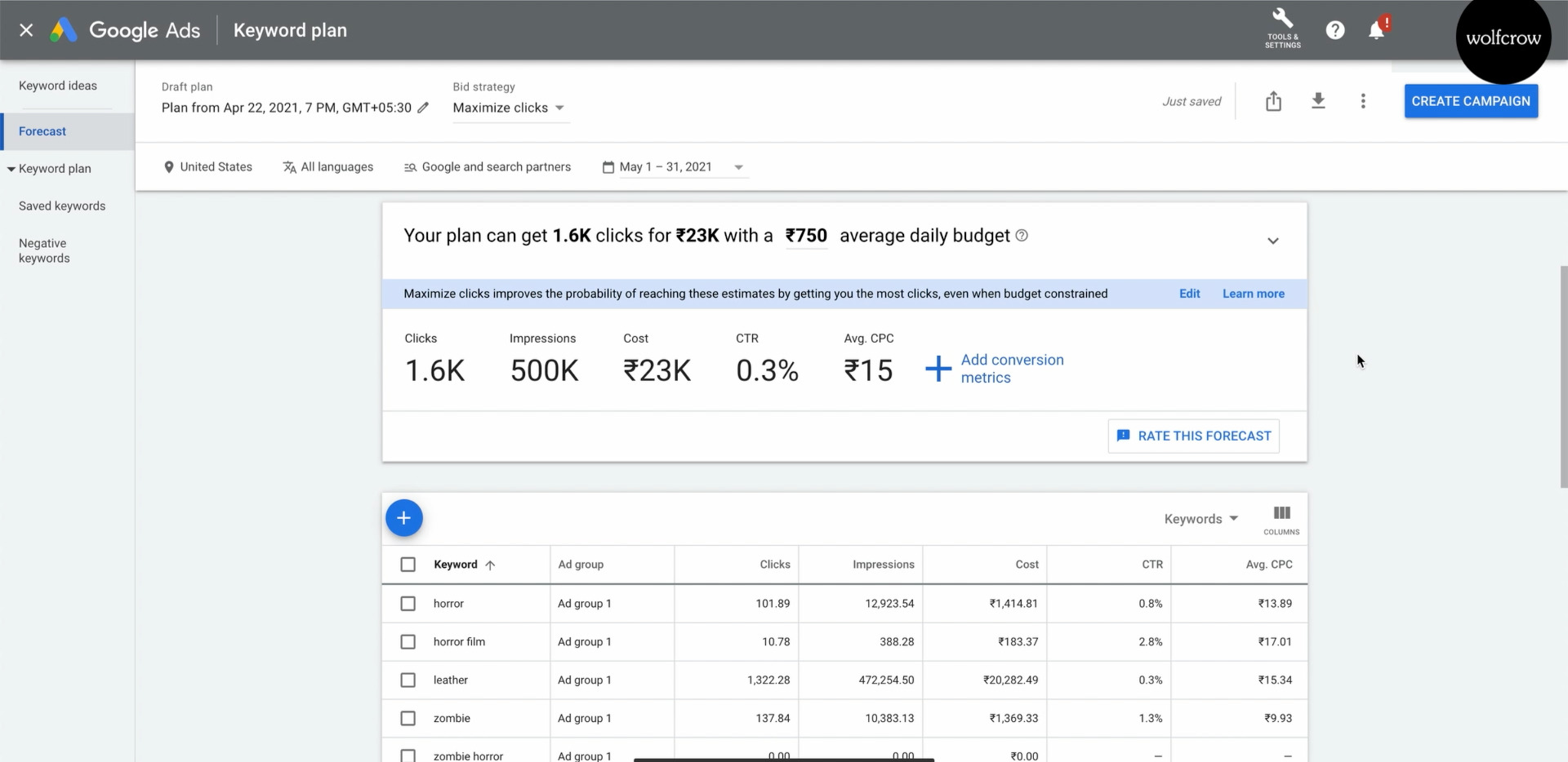 You can go lower or higher with your spending. The CPC (cost per click) can change drastically depending on the keywords and geographical area. Don’t use this data to make y our own decisions!