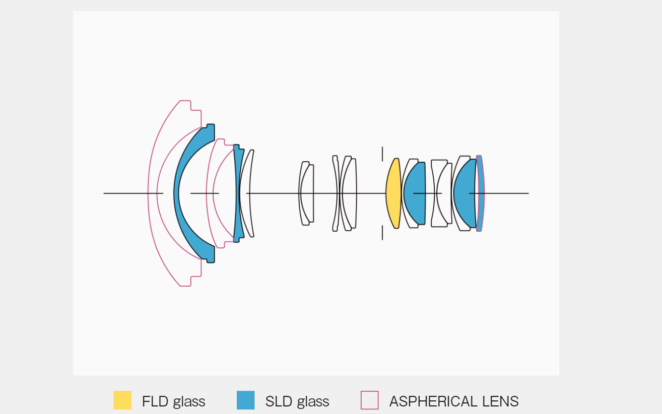 The optical design consists of 18 elements in 13 groups, including SLD glasses, FLD glasses and aspherical lenses.