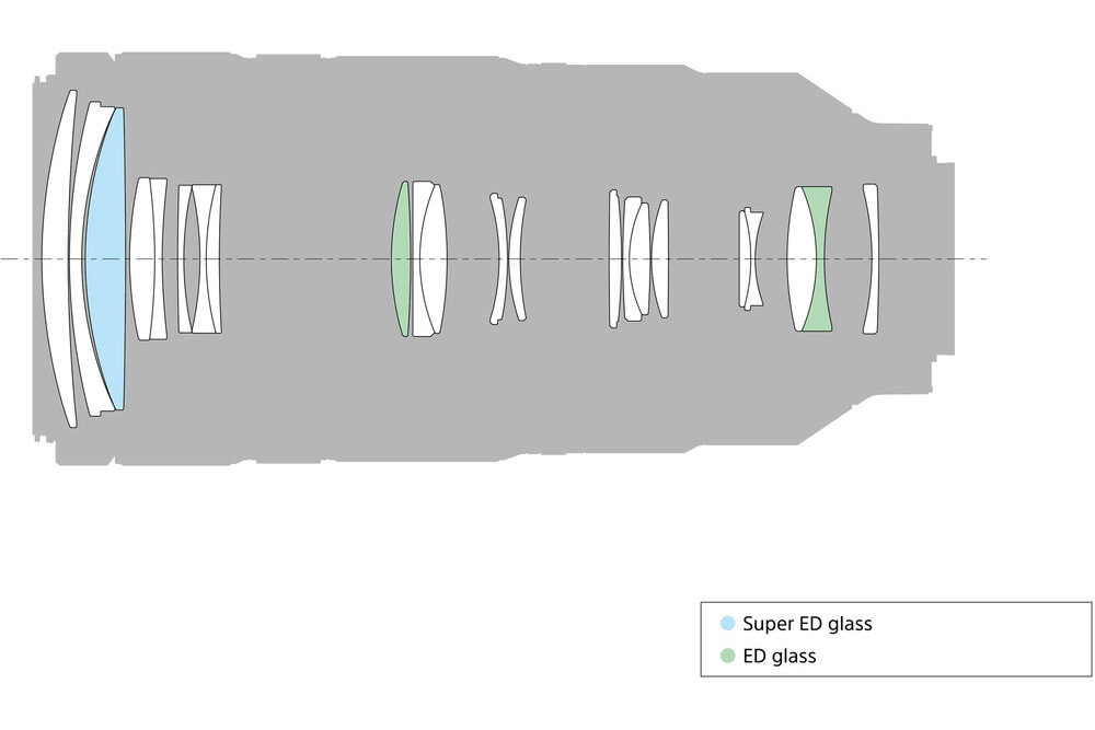 The optical design consists of 16 elements in 13 groups, including ED (Extra-low Dispersion) glass and a Super ED lens elements.