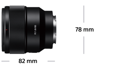The Sony FE 85mm f/1.8 (AmazonB&H) has a diameter of 78mm and a length of 83mm. It weighs around 371 grams. It is incredibly light for its focal length.