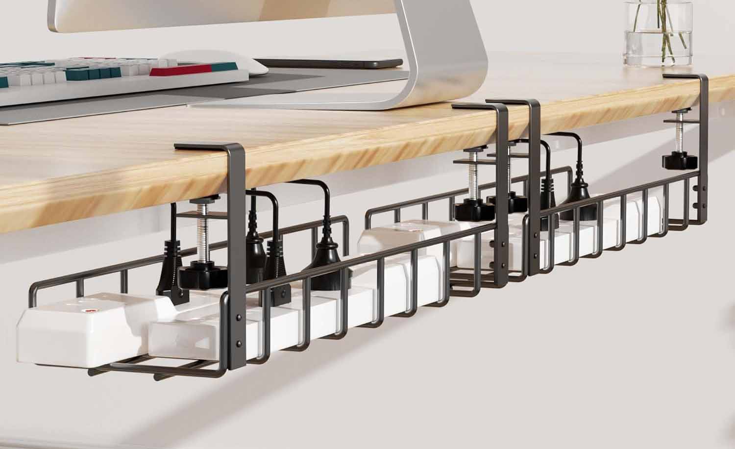 The power strip can hide under the desk tray, and it makes a big difference.
