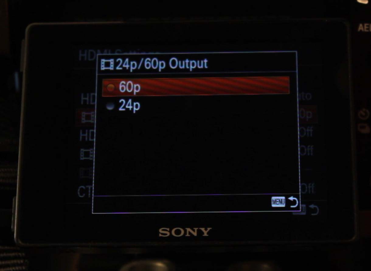 The camera does not transmit 120p or 100p via HDMI, but if you want to monitor at 60p, you can. Choose the one that corresponds to your final output. Usually, it’s 24p. If you’re recording in 60p for a 60p playback, choose 60p. This feature only works if the resolution is 1080p, and not 1080i.