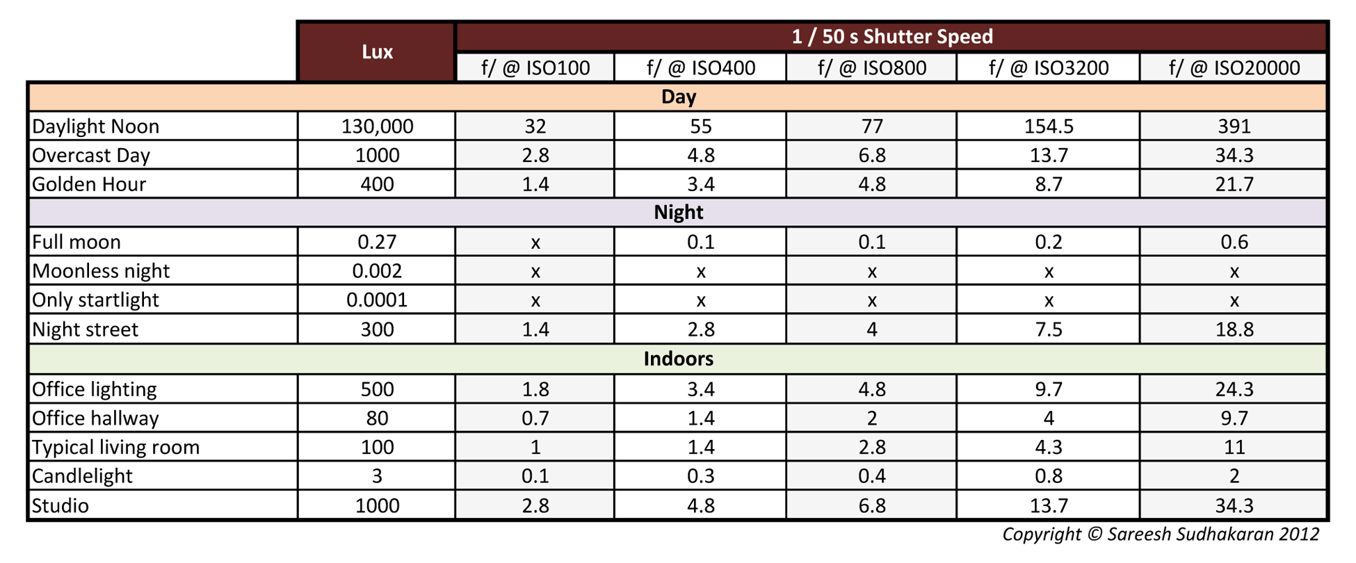 You can see the difference is from a highest of about 130,000 lux (noon) to just 0.0001 lux (starlight, no moon). That’s a contrast ratio of 1.3 billion:1. It does not include specular highlights, of course, but it does relate to the results we got above.