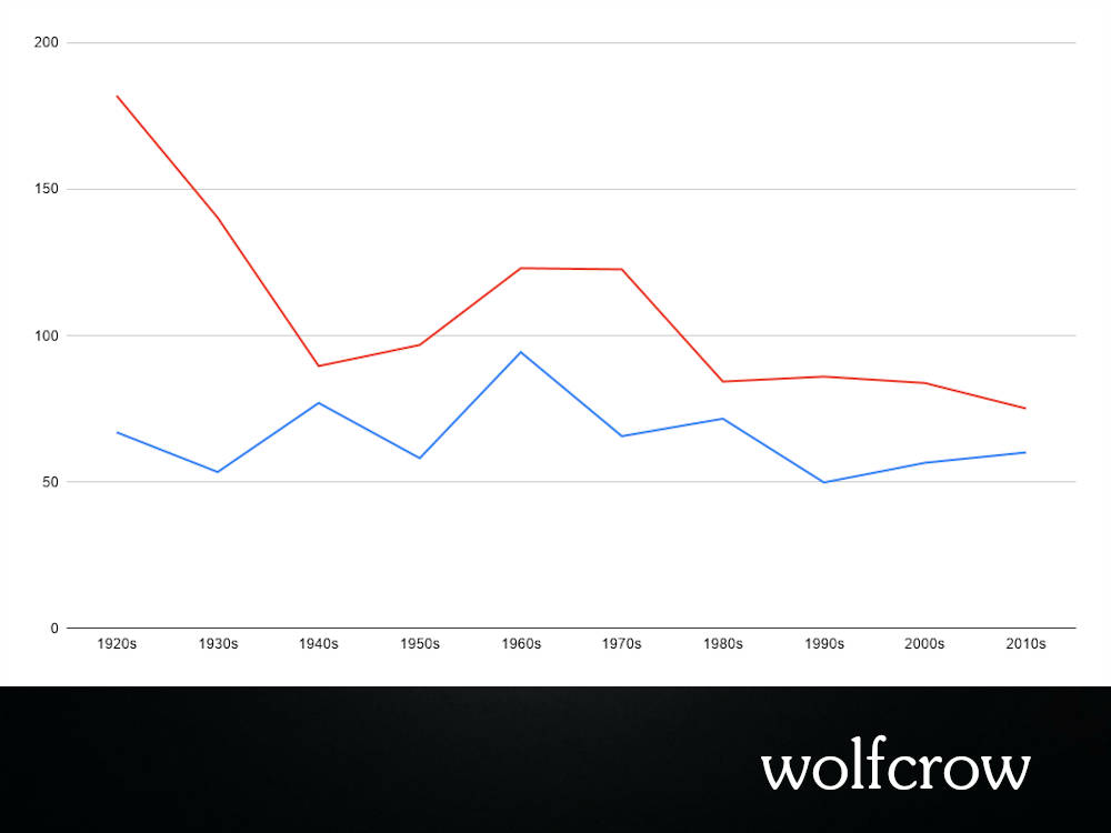 I’ve made two averages. One is the total, taking into account all films in that decade. The second is the average of movies that have a schedule less than 110 days. This eliminates those movies that took too long.