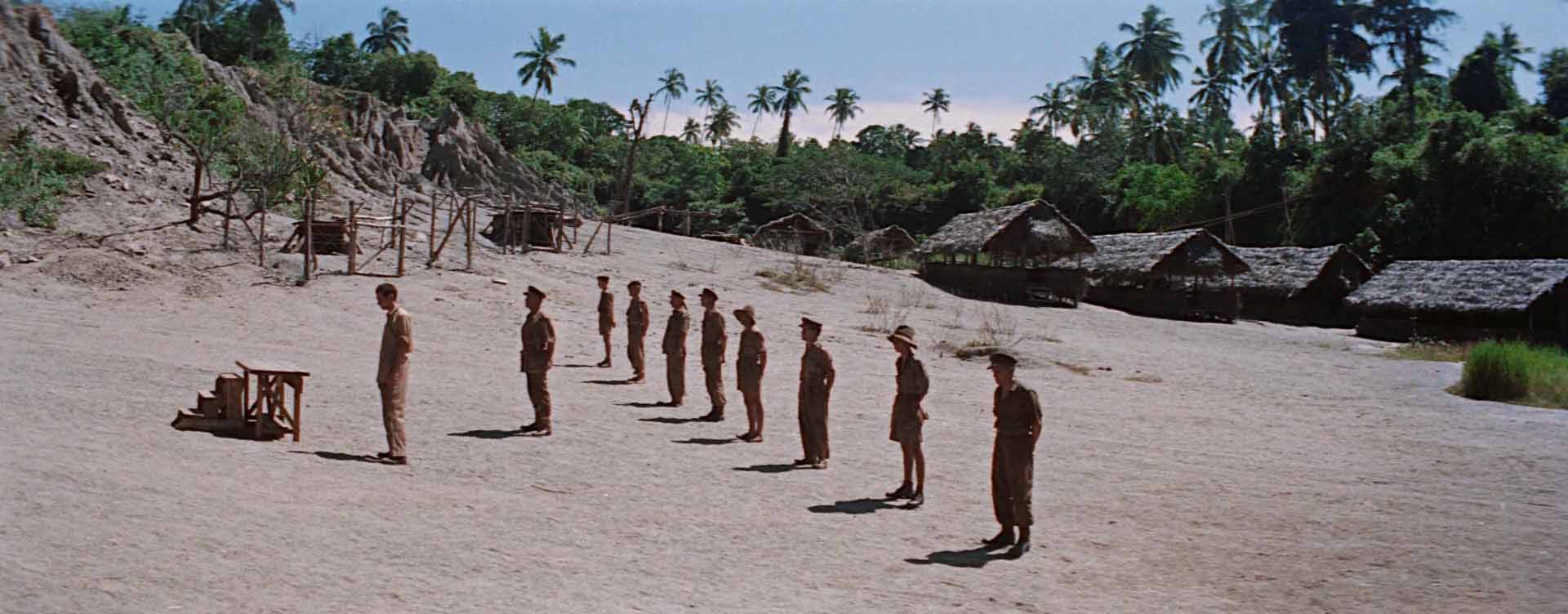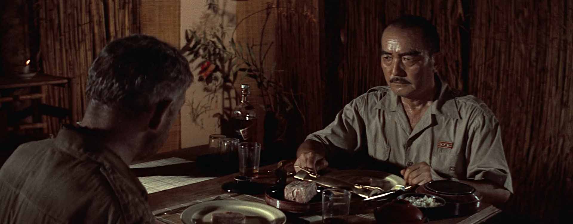 Look at the way Lean builds triangles. Nicholson, Saito, Clipton. Later, Shears, Warden, Joyce. Triangles lock power into the frame and let the camera float without losing the argument. When the actors move, the geometry shifts and the scene turns. The wide frame gives everyone room to be right and wrong in the same shot.