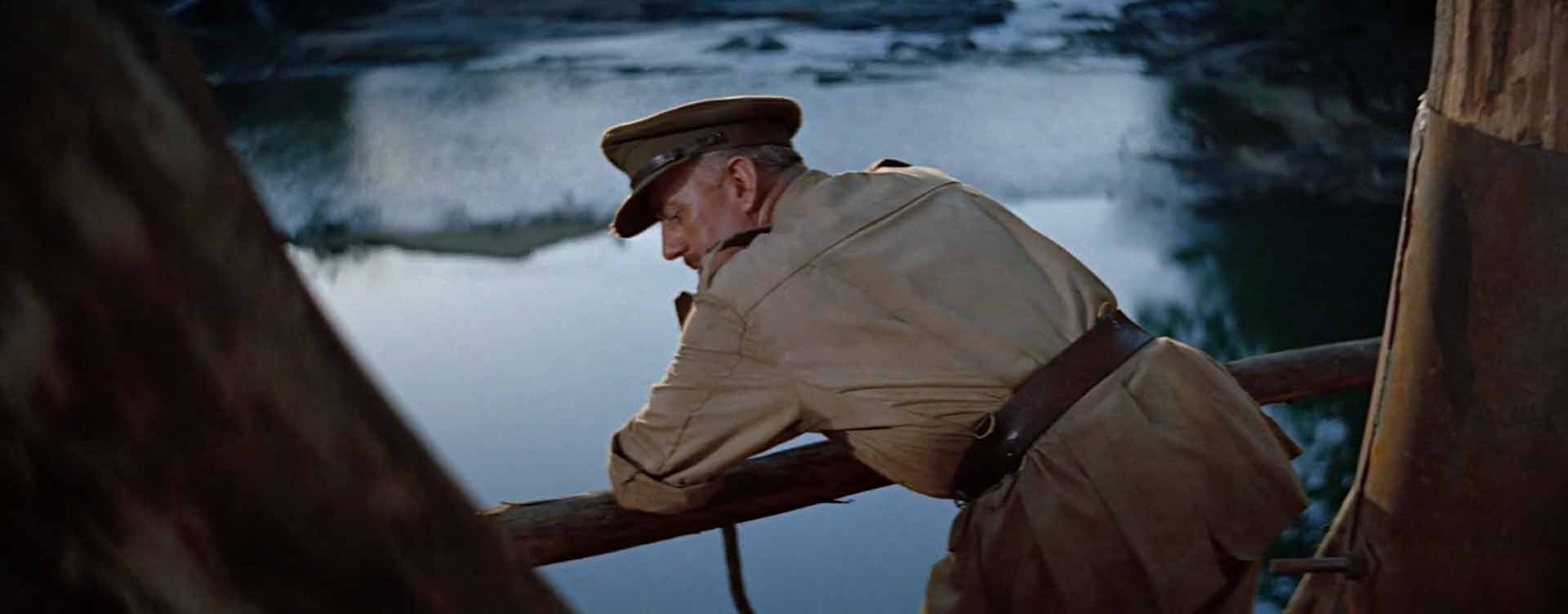 Eastmancolor stock has a clean, gently warm palette when you give it proper light. The film uses the tropical sun like a giant key and lets canopy shadow soften faces instead of chasing perfect fill. Khaki and olive pushed against blue-green river and sky give the frame its quiet color story.